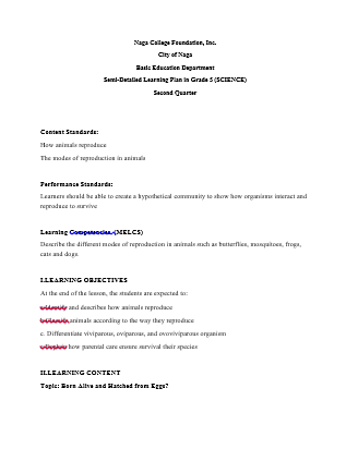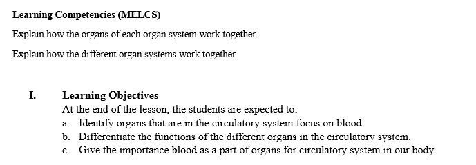 For example, for grade VI science subject material on the human body system, the learning objectives are that students are expected to be able to identify the organs in the circulatory system with a focus on blood